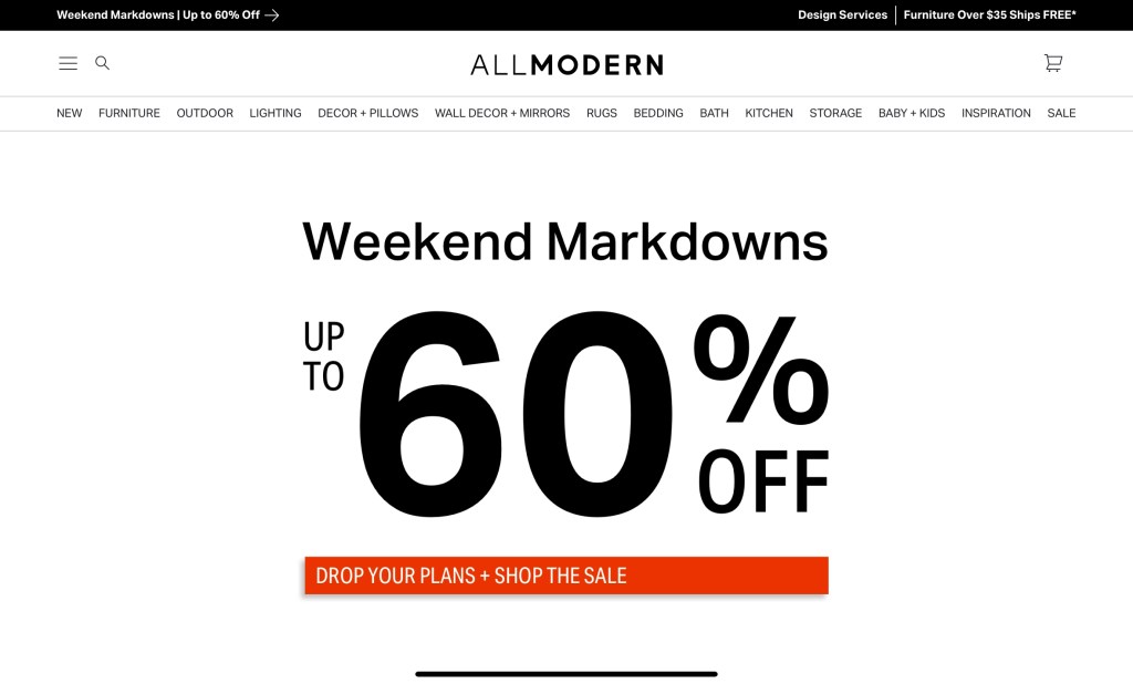ALLMODERN is a furniture store that houses modern and mid-century modern high-quality items. Everyone loves high-quality products but not everyone has high-quality money! ALLMODERN is there for consumers like me who aren’t exactly the target market but working towards being one and knowing that they support consumers like this by always having discounts on pretty much all categories just keeps us coming back!