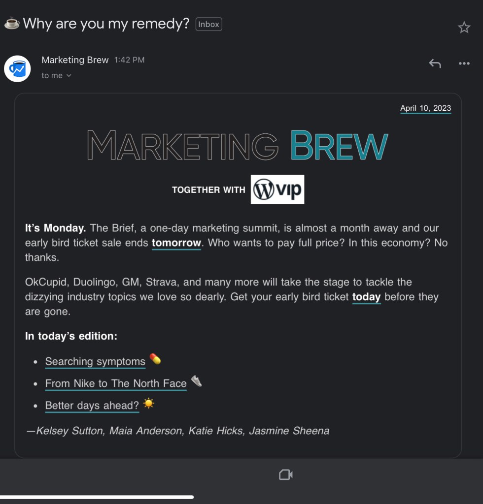 Marketing Brew’s emails are always jam-packed with the latest and most relevant industry happenings, they fill you in, just in case you missed recent news, they have fun quizzes and facts and they have a referral program where you can get some cool freebies just by sharing your referral link! All-in-all, they make sure that their audiences stop and read what they got in store for them!